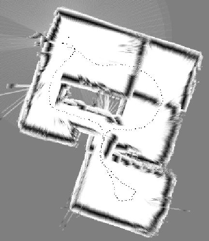 This will generate and display a PGM file showing the map and robot trajctory for the Lidar scan and odometry data in the log file exp2.dat. If you have the Python Imaging Library installed, you can also try the log2png.py script to generate a a PNG file instead. If you have installed Matplotlib, you can see a “live” animation by doing